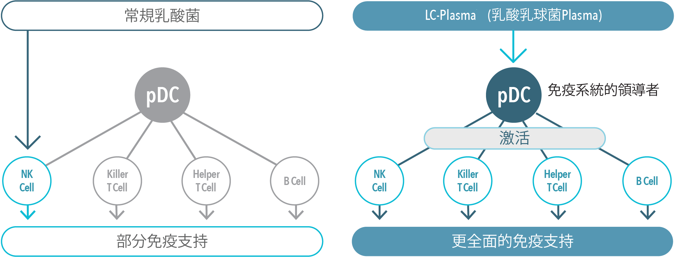 相較之下,LC-Plasma 是一種尖端的後生元(非活菌),可透過直接活化主要位於小腸的 pDC 來增強身體的防禦系統。